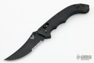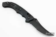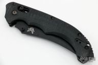 This 860 Bedlam from Benchmade features a black finished trailing point blade with swedge, dual thumb studs and notched thumb rest. The handle is comprised of textured black G10 scales over black coated steel liners and steel backspacer with lanyard hole and glass breaker. Black coated tip up pocket clip can be mounted for right or left hand carry. Has some scuffs and scratches, otherwise good user condition. Discontinued.