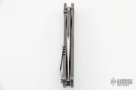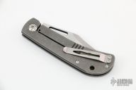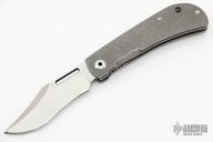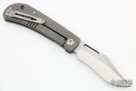 This Rebel Framelock from Jim Burke has a satin finished blade with swedge and thumbhole. The handle has a tumbled titanium frame with a titanium tip up clip. Lanyard hole in pommel. Nice detent, lockup and blade seating. Excellent condition.