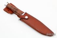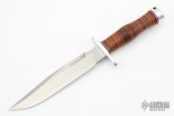 This Model 1-7 by Blackjack Knives features a satin finished blade with false top edge, .215" thick and 1.204" deep, hidden tang construction. The handle has an aluminum guard, stacked leather grip with red/white/black spacers, aluminum butt. Comes with brown leather sheath and original box. Has a couple very light scratches, otherwise excellent condition.