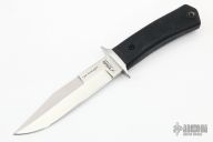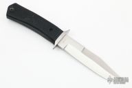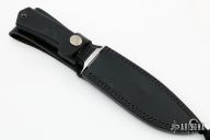 This Archangel from Blackjack Knives features a satin finish clip point blade with false top edge, .196" blade stock and 1.065" blade depth, hidden tang construction. The handle is comprised of a stainless steel guard and rubber grip with lanyard tube. Includes black leather sheath with belt loop. Excellent condition.