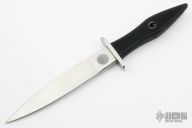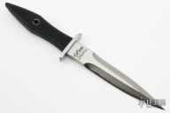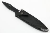 This Blackmoor Dirk by Blackjack knives features a satin finish double-edged 7Cr17 blade, 3/16" blade stock, 1" blade depth. Hidden tang construction with Kraton handle. This is one of the newer blackjack knives with the ace of spades logo. Comes with original black leather sheath and box. Excellent condition.