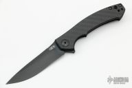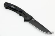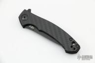 The Dmitry Sinkevich designed ZT 0450CF knife is a compact version of the award-winning 0454 folder. It has an S35VN stainless steel blade with a black DLC finish. A flipper and the KVT ball-bearing pivot produce reliable, quick one-hand deployment. The titanium handle has a sturdy frame lock and a stylish carbon fiber scale that contrasts nicely with the black blade. A reversible tip-up carry pocket clip rounds out the package.  S/N 15739.  Excellent Condition.