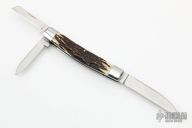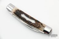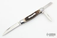This Splitback Whittler by Bill Ruple features a large single blade with nail nick and two smaller blades with nail nicks. All blades are hand rub satin finished and have half-stops, flush in all positions. The handle has pinched stainless steel bolsters, stag covers with a stainless steel escutcheon, stainless steel liners and springs. Includes a padded zippered case.  Excellent Condition.