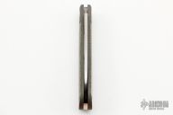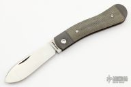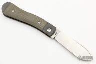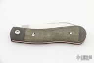 This K9 Jack (Dog Leg) slipjoint model by Jack Wolf Knives featuring a satin finished drop point blade with nailnick. The handle has integral bead blast finish pinched and fluted titanium front and rear bolsters and liners, micarta scales with a stainless spring. Comes with box, metallic tube with Sean Tiffany artwork, leather slip, sticker and microfiber cleaning cloth. New from Maker.