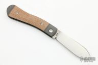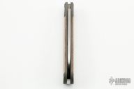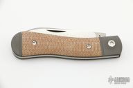 This K9 Jack (Dog Leg) slipjoint model by Jack Wolf Knives featuring a satin finished drop point blade with nailnick. The handle has integral bead blast finish pinched and fluted titanium front and rear bolsters and liners, micarta scales with a stainless spring. Comes with box, metallic tube with Sean Tiffany artwork, leather slip, sticker and microfiber cleaning cloth. New from Maker.