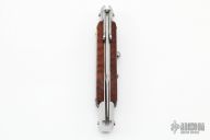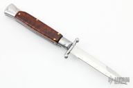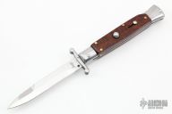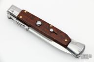 This Swing Guard Lockback Auto by AKC Italy has a polished stainless steel spear point blade with false top edge. Handle has snakewood scales with stainless steel bolsters, steel liners, and stainless steel back spacer and lock. Skull push button.  Has safety. Has a few light scratches, otherwise excellent condition.