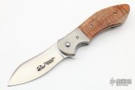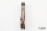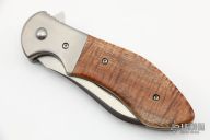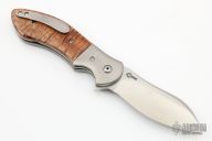 This Nessmuk Flipper by Scot Matsuoka features a satin finished blade with false top edge and flipper. The handle has orange peel finished titanium dovetailed bolsters, curly Koa wood scales, orange peel finished titanium liners and tip up clip. Nice detent, lockup and blade seating. Comes with a zippered case. Excellent condition.