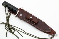 The Model 12 was made to meet the demand for a heavy-duty sporting knife of the Bowie type. This non-catalog version has a Model 14 grind. This knife has a 9" stainless steel blade, forward curved nickel silver guard, black linen micarta finger grip style handle, red/white/blue spacers. Includes a waxed brown leather sheath. New Condition.