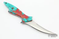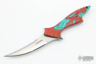 This Navajo Pixie by Jerry Hossom features nicely shaped Reconstituted Sonoran Sunset Stone scales with red liners, brass and mosaic pins. Hand rubbed satin finished blade with sharpened top edge, .156" blade stock and .850" blade depth, full tapered tang construction. Fits nicely in hand. Includes a zippered case. Excellent condition.