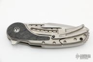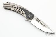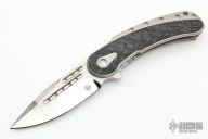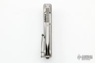 This Bodega Beggatti by Todd Begg Knives has a mirror finished multi-ground spear point blade with notched thumbrest, satin flats, fullers and flipper, 1/4" blade stock. Has IKBS. The handle has 3/16" thick satin finished titanium frame with carbon fiber inlays, a titanium lockbar and tip up clip, 1/4" thick titanium backspacer with crosshatch jimping. Has nice detent, lockup and blade seating. Very smooth action. Excellent condition. Comes with original box.
