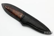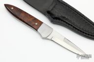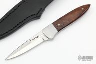 This small fighter features a double-edged hollow ground blade with mirror polished hollows and satin finished flats. .168" Blade Stock. .817" Blade Depth. The handle has steel dovetailed bolsters, wood scales with mosaic pins. File work on blade spine. Comes with a leather sheath. Light scratches are visible on the blade and bolsters otherwise the knife is in excellent condition.