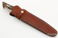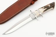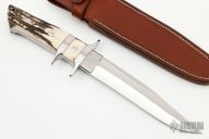 This Chute Knife by Ricardo Romano features a mirror polished clip point blade with a tapered tang construction. .277" Blade Stock. 1.242" Blade Depth. The handle features steel gard and stag scales over red liners. Includes a brown leather sheath. Light scratches are visible on the guards otherwise the knife is in excellent condition.