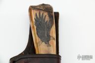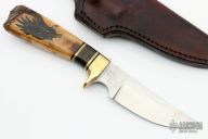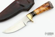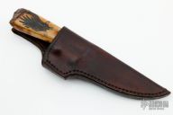 This Skinner by Al Warren features a satin finished blade with .162" blade stock and 1.162" blade depth, hidden tang construction. The handle has a brass guard, fossil walrus ivory grip with black/brass/leather spacers. The handle has been scrimshawed by the Lahaina Scrimshaw Factory. Comes with a COA dated 10/4/87, the COA is from the Lahaina Scrimshaw Factory in Hawaii. Comes with a brown leather sheath. The sheath and blade are #299. Excellent condition.