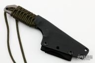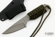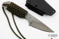 This SA by Strider Knives has a bead blast finish blade and green cord wrap handle, .241" blade thickness and 1.253" blade depth. Notches on thumbrest and rear of handle. Includes a kydex sheath. Sheathing scuffs are visible on the blade otherwise the knife is in excellent condition.