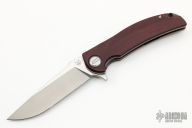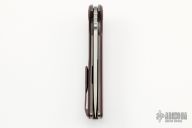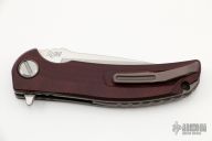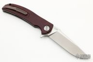 ThisSoft Overkill by Shirogorov and RJ Martin features a M398 blade with notched thumbrest and a flipper. The handle has a blasted and milled titanium frame, maroon canvas micarta scales, anodize finish titanium pivot collars, backspacer and tip up clip with hidden screws. Has RBS, nice detent, lockup and blade seating. Has a very minor mark on the edge of the clip, i didn't even notice it until the picture was taken, you can barely notice it in person, otherwise excellent condition. #300/300. Comes with original box and papers.