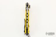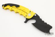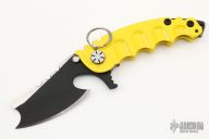This Man of War GEN2 flipper by TS Heeter features a black multi-ground cleaver blade with notched thumbrest, fullers, thumbhole and flipper. The handle has a yellow titanium frame with tip up reversible titanium clip, steel backspacer. Has a pin with split ring that can be used to lock the blade open, or it can be removed to reveal a lanyard hole. Nice detent, lockup and blade seating. Excellent condition. Includes COA and zippered case. Dated 11-25-18. #000