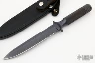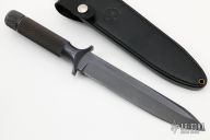 This Project 1 Fixed Blade by Chris Reeve has a non-reflective Kalgard coated A2 stainless steel spear point partially serrated blade, .255" blade stock, 1.250" depth. Handle and blade are both made from a single block of steel. Handle is knurled with double guard and removable butt cap with lanyard hole. Comes with original black leather sheath. Has some light scuffs/scratches, otherwise excellent condition.