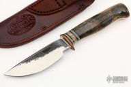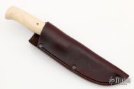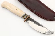 This Hunter by James Behring features a satin finished and hammer marked blade with false top edge, .183" blade stock and 1.100" blade depth, hidden tang construction. The handle has a copper guard, ox horn and mammoth ivory grip with copper pin and black/ox boss/white/ spacers. Comes with black leather sheath with belt loop. Excellent condition.