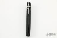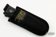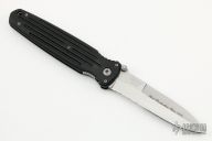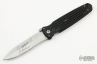 This Applegate Fairbairn Combat Folder by Gerber has a bead blasted stainless steel partially serrated spear point blade with dual thumb studs and false top edge. Handle is black contoured polymer with single stainless steel liner and lanyard hole. Has a few light scratches and some light spots on the blade, otherwise good condition. Comes with original sheath.