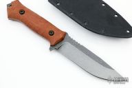 This knife by AKAT Knives features a black tumbled blade with notched thumbrest, .176" blade stock and 1.332" blade depth, full tang construction. The handle has natural linen micarta scales. Comes with a kydex sheath. Excellent condition.