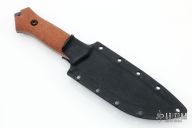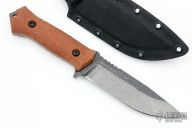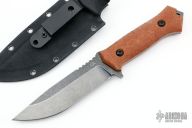 This knife by AKAT Knives features a black tumbled blade with notched thumbrest, .176" blade stock and 1.332" blade depth, full tang construction. The handle has natural linen micarta scales. Comes with a kydex sheath. Excellent condition.