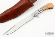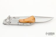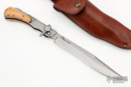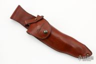 This knife has a satin finished blade. The handle has a bead blasted stainless steel frame. Has a manual picklock style locking mechanism, disengage by pulling the trigger. This one has a couple light scuffs, otherwise excellent condition. Comes with a brown leather sheath.