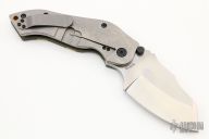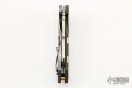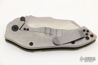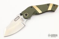 This knife has a satin finished S35VN blade with fullers, notched thumbrest and dual thumbstuds. The handle has an OD Green G-10 and tumbled titanium frame with bronze inlays and pivot collars, tumbled titanium tip up clip. Has stainless lockface insert with integral over travel stop. New from maker. Comes with original packaging.