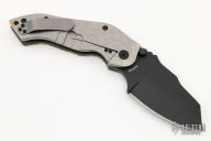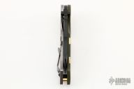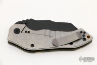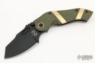 This knife has a black finished S35VN blade with fullers, notched thumbrest and dual thumbstuds. The handle has an OD Green G-10 and tumbled titanium frame with bronze inlays and pivot collars, tumbled titanium tip up clip. Has stainless lockface insert with integral over travel stop. New from maker. Comes with original packaging.