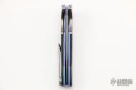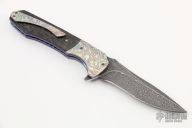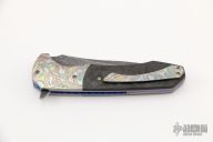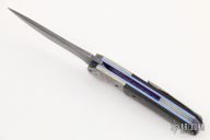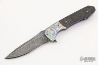 This Axis linerlock flipper by William Tuch features a Damascus recurve blade with flipper. The handle has Timascus bolsters, carbon fiber scales, anodized titanium liners with jeweled interiors, fluted timascus backspacer and tip up clip. Rides on bearings, nice detent and blade seating. Comes with zippered case. Lockup has some play. Excellent condition.
