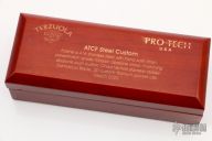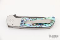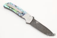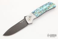 This ATCF Auto by Pro-Tech features a Chad Nichols Stainless Ladder Pattern Damascus blade with notched thumbrest. The handle has a 416 SS frame with abalone scales, tip up milled titanium clip with hidden screws. Comes with original box. Excellent condition.