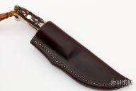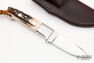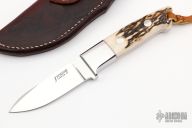 This Hunter by John Young features a mirror finished drop point blade, .194" blade stock and .957" blade depth, full tapered tang construction. The handle has mirror polished stainless steel bolsters, stag scales with red liners. Comes with a brown leather sheath. Excellent condition.