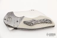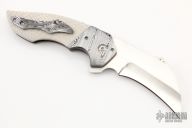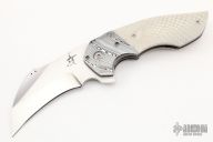 This Falcon X from Greg Lightfoot features a satin finished hawkbill blade with asymetrical swedge, notched thumbrest and flipper. The handle has Damasteel bolsters, Snakeskin Juma scales, bead blasted titanium liners, floating Damasteel backspacer and tip up clip. Titanium hardware and pivot. Includes original hard case and COA. dated June 2022. Excellent condition.