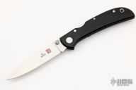 This Hawk Ultralight lock back by Al Mar Knives has a satin finish blade with dual thumb studs. Black linen micarta scales and a black pocket clip. Strong lock up. Has a few very light scratches, otherwise excellent condition.