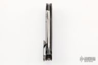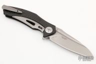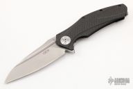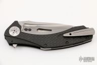 This discontinued 0777 Flipper (#0558) has a M390 drop point blade with fullers, notched thumb rest and flipper. Handle is black carbon fiber with titanium frame lock and adjustable lock stop, satin finished titanium deep carry tip up clip, titanium milled spine spacer, and satin finished stainless steel pivot. Includes original box and papers. Has a couple of light scuffs, otherwise excellent condition.