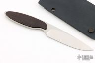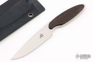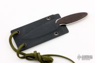 This neck knife by JD Van Deventer features a satin finished drop point blade with .096" blade stock and .69" blade depth, full tang construction. The handle has wood scales. Comes with kydex neck sheath. Excellent Condition.