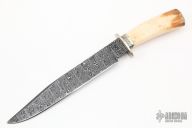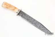 This Bowie by Master Smith Jim Walker features a clip point Damascus blade, .202" blade stock and 1.433" blade depth, hidden tang construction. The handle has nickel silver guard, fileworked spacer and butt cap with a walrus ivory grip. Comes with a zippered case. Excellent condition.