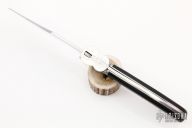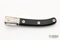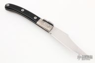 This Navaja knife by Denis Cherevichnik features an alloy 9HS Steel blade (150Cr14). The handle has steel bolsters and liners, steel backspacer and lock. G10 scales. Has some light scuffs and scratches, otherwise excellent condition.