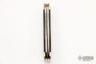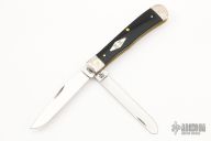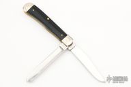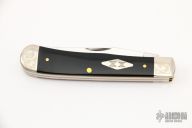 This two-blade trapper by Case has two mirror polished blades both with nail nicks. The handle has factory engraved nickel silver bolsters, black covers with a nickel silver escutcheon, brass liners and stainless steel springs. Has a couple light scratches, otherwise excellent condition.