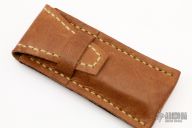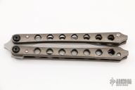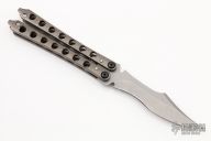 This MAC Balisong by Jeremy Marsh features a stonewash finish blade with swedge. The handle has tumble finish titanium handles with satin finish spacers. Includes a leather case. Excellent condition.