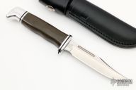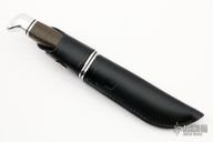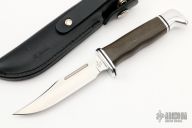 This Model 117 Brahma by Buck Knives features a satin finished clip point blade with false top edge and fullers, .118" blade stock and .787" blade depth, hidden tang construction. The handle has an aluminum guard and butt, and a green canvas micarta grip. Comes with original black leather sheath. Excellent condition.  Coems with COA
