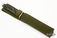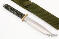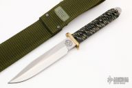 This Model 5 by EK Knives features a satin finish blade with false top edge and a full tang construction, .179" Blade Stock.  1.251" Blade Depth.  The handle has a brass guard and an epoxied cord wrapped grip. The grip is not original. Comes with nylon sheath. Light sheathing marks are visible on the blade otherwise the knife is in excellent condition.