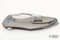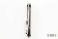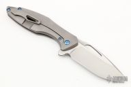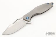 This Arius by Koenig knives features a two-tone burnished blade with thumbhole and flipper. The handle has a bead blasted smooth titanium frame with a titanium tip up clip, anodized titanium backspacer. Has ceramic bearings and a ceramic detent ball. Nice detent, lockup and blade seating. Comes with original box and COA April 18, 2022. Excellent condition.