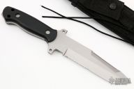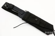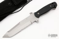 This Buck Knives model 189 Intrepid features a partially serrated, tanto blade with full tang construction and thickness of .25" and depth of 1.56".  Black G10 scales. Sharpened top edge and serrations.  Knife comes with a kydex sheath with nylon belt loop. Knife is in excellent condition and shows only sheathing marks on blade.