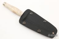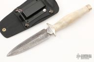 This Dagger by Barrett & Clair features a double edged Damascus blade with .117" blade stock and .952" blade depth, hidden tang construction. The handle has a nickel silver guard and butt with a stag grip. Comes with a kydex sheath with boot clip. Excellent condition.
