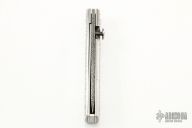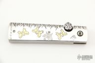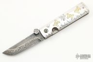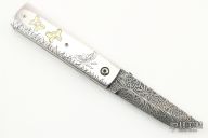This Folder by Scott Slobodian features a Paul Strand "Explosion" Damascus steel blade with and single engraved silver thumbstud. The handle has pure silver scales with engraving and gold inlays, titanium liners, bead blasted stainless steel backspacer. Knife opens and closes smoothly and locks open with no blade play. Nice blade seating. Has some light scratches, otherwise excellent condition. Comes with a silver pendant with similar engraving and gold inlay, hung on a rubber necklace.