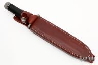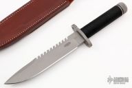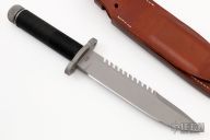 This survival knife by Timberline features a bead blasted spear point blade with serrated top edge and 10 split saw-teeth on blade spine, .254" blade stock and 1.363" blade depth, hidden tang construction. The handle has a bead blasted titanium double guard, hollow cord wrapped handle, and stainless steel removable butt cap with an O-ring to make it water-proof. Comes with brown leather sheath that has a leather flap with a snap covering a honing stone that is embedded in the sheath. Inside the handle is a roll-up kit with a fire stick, and slots to hold other items. The cord that is around the handle is also one piece of cord that can be removed for survival use. The removable butt cap has a polished flat inside that can be used for signaling. The blade is marked "Custom USN-13". This knife was well-thought-out and provides everything possible for survival. Excellent condition.