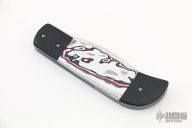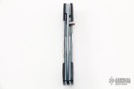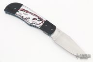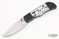 This knife by Jake Elenbaas features a clip point hand rub satin finished blade with single thumbstud with red stone inlay. The handle has black G-10 bolsters, front and rear, Fordite scales, anodized titanium liners with jeweled interiors and a black G-10 backspacer. Nice lockup and blade seating. Comes with COA. New from maker.