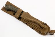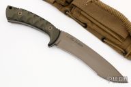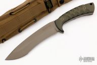 This Kraken by Rustic Knives features an acid tumble finished blade with notched thumbrest, .260" blade stock and 1.33" blade depth, full tang construction with black and green G-10 scales. Comes with a nylon sheath. Has some marks on the blade, excellent condition.