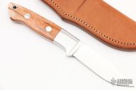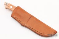 This Drop Point Hunter by John Young features a mirror polished blade with .167" blade stock and .953" blade depth, full tapered tang construction. The handle has a mirror polished stainless wide bolster/guard, giraffe bone scales and red liners. Lanyard hole at butt. Comes with brown leather sheath. Has some light scratches, otherwise excellent condition. This knife is featured on John Young's website in his hunting knives gallery.