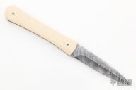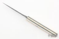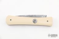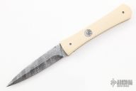 This Bent Dagger side opening automatic by Kyle Valloton features a dagger ground Alabama Damascus blade with false top edge. The handle has vintage Westinghouse ivory paper micarta scales with blue G-10 liners, Damascus push button, fileworked stainless steel backspacer, fileworked anodized titanium liners. Nice action, lockup and blade seating. Comes with padded zippered case and COA. New from maker at the 2022 USN Gathering.